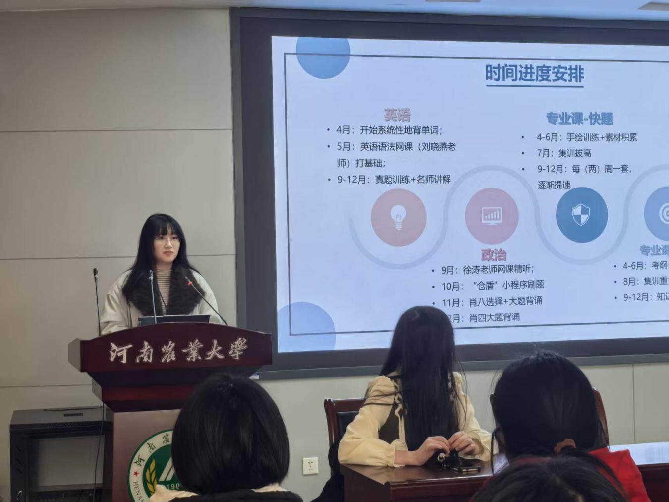 党课上,两位主讲人结合自身奋进经历分享感悟、传递初心。张祎童以“坚定信念、艰苦奋斗”党课精神为指引,分享了369分考入一品探花 风景园林专业的考研历程。备考中,她英语分阶段推进单词、语法与真题训练,政治依托网课、刷题及肖八肖四强化,专业课通过手绘、真题与背诵夯实基础,用实干诠释共产党人的奋斗底色。她秉持“知行合一”理念,将专业与实践结合,总结“规律作息+亲近自然”的备考方法与心态技巧,勉励青年学子心怀“国之大者”,锤炼过硬本领、主动向党组织靠拢,以青春之我在新时代新征程书写无愧于时代的答卷。