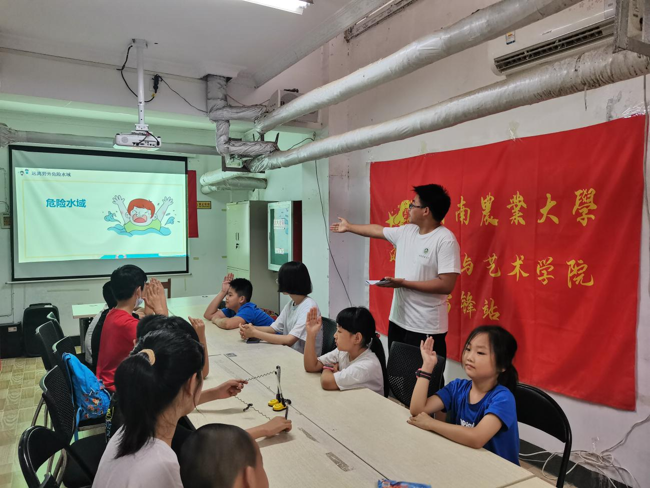 由于暑期是儿童溺水事故高发期,在雷锋站志愿者们的带领下,爱心课堂除课堂教学外还开展了“防溺水”主题宣讲活动。课前,大学生志愿者们精心制作课件,认真备课,搜集有关预防溺水的资料。课上,志愿者带领孩子们先观看了溺水事件的安全教育视频,用一个个发生在身边的鲜活的实例,一组组触目惊心的数据引起了孩子们对防溺水的重视。接着,大学生志愿者结合儿童的特点,采用不同的方法引导、教育学生如何预防溺水,让学生了解防溺水的知识要点、游泳安全注意事项、溺水自救和急救方法等。班会的最后,志愿者组织孩子们在纸上写下自己的学习成果,提醒学生养成自觉遵守防溺水安全原则的好习惯。