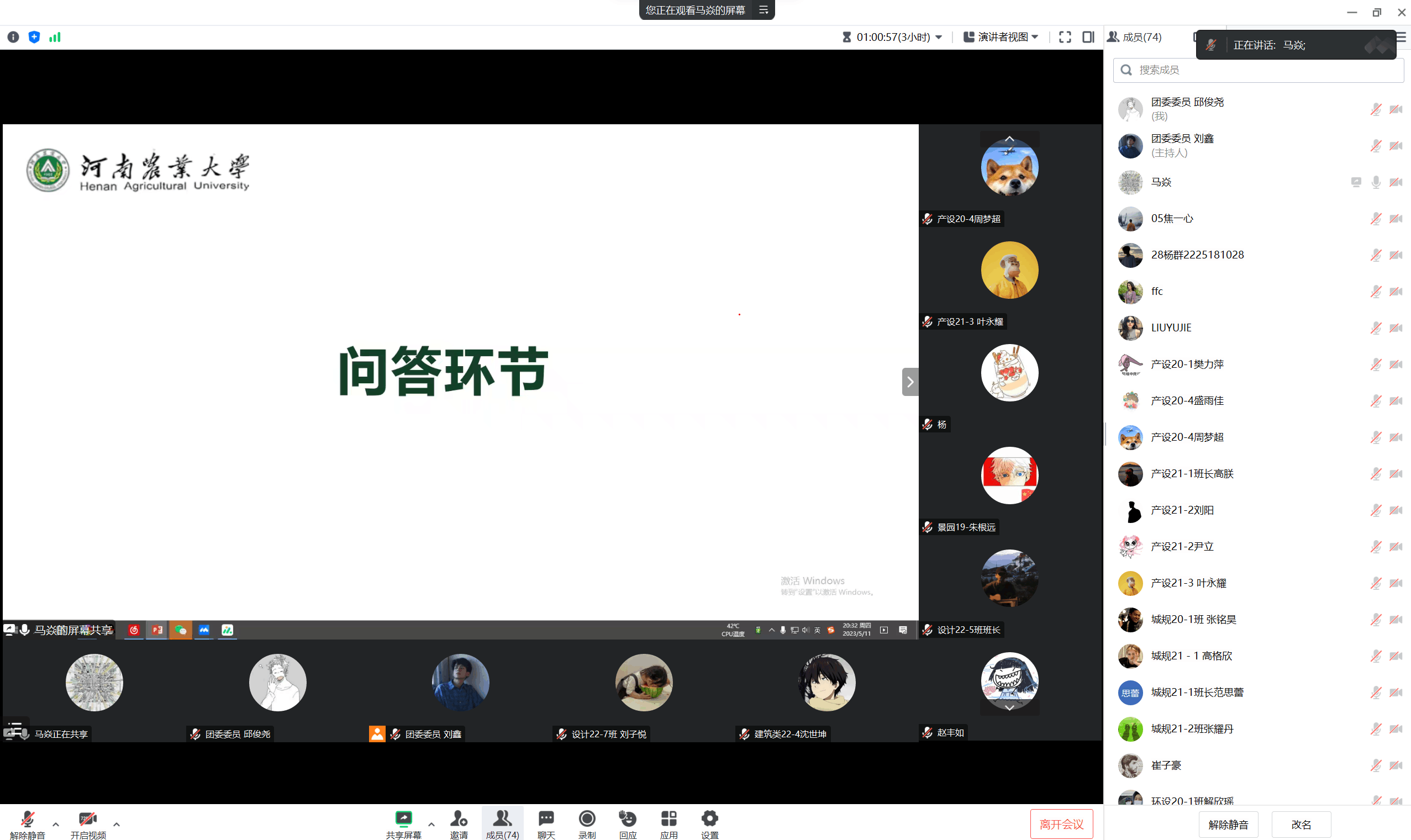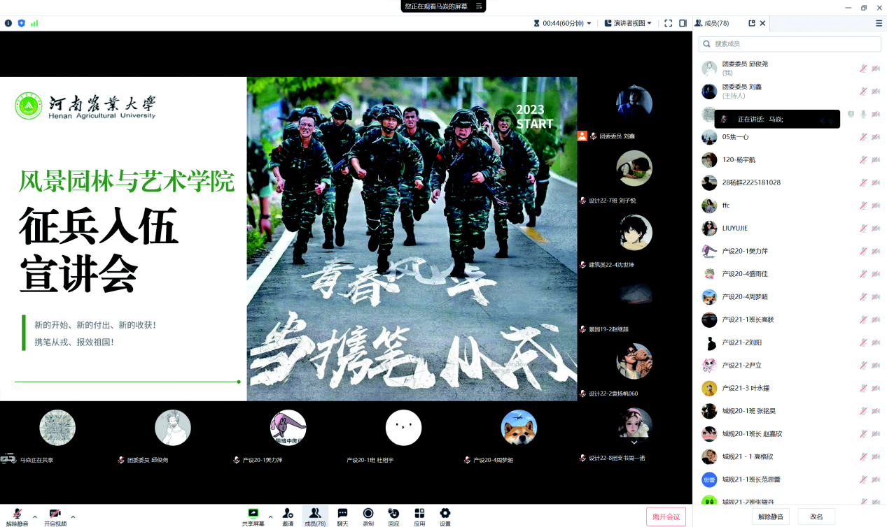 团委老师马焱于5月11日晚主持召开应征入伍线上动员宣讲会,各年级班长支书及有参军意向学生参会。