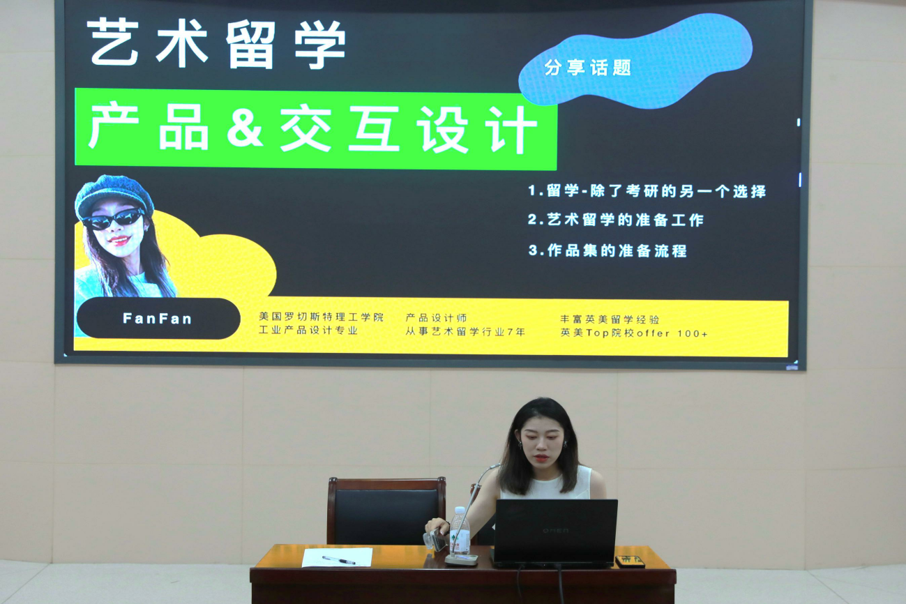 随后,特邀出国留学生代表从国内外考研数据对比、院校选择与申请、个人能力提升等方面进行分析,他们结合实际案例讲解了留学优势,涵盖了不同申请路径及作品集打造,让学生们对出国留学有了更加清晰的认识和了解。