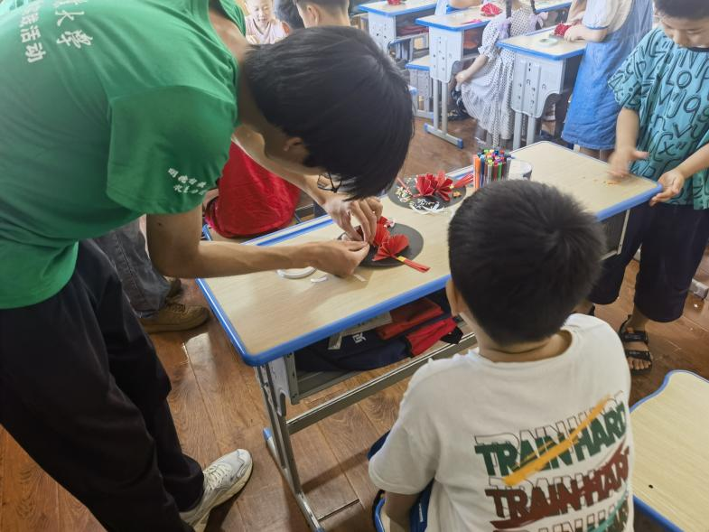 本次课堂的主题是“灯笼的手工制作”,团队成员先向孩子们讲解红色灯笼在中国传统文化中的寓意,带领他们了解中国传统文化知识内涵,接着团队成员用红色卡纸制作灯笼并逐步讲解,随后由孩子们动手实践,通过手工制作,孩子们亲身体会到了中国传统文化中具有的独特美感和寓意。课堂上,团队成员细心引导,积极互动,孩子们经过耐心制作,都完成了独属于自己的手工作品,脸上洋溢着快乐的笑容。