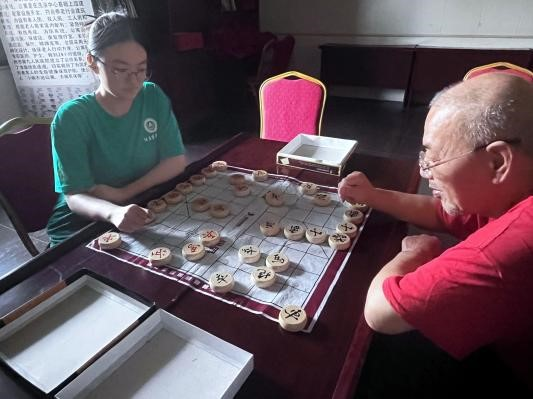 活动中,志愿者与老人亲密交谈,询问生活起居情况,聆听长辈成长故事,让老人感受到亲人般的关怀和温暖。在随后的象棋友谊赛中,双方切磋交流、欢声笑语、暖意融融,为平日清净的养老院带来了青春活力,让老人在比赛中获得了乐趣与陪伴的温暖。临别时,老人依依不舍地拉着志愿者的手,勉励志愿者们努力学习,早日成为国家的栋梁之才。