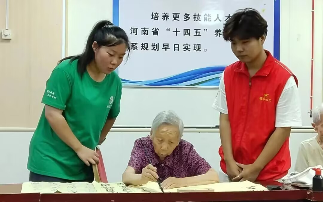 下午,志愿者到达养老院,与老人们展开“认颜色”游戏,游戏中老人们兴致勃勃,目不转睛,与志愿者展开游戏大比拼。在书法环节志愿者与老人们一同执笔上阵,一幅幅整洁工整、娟秀有力的书法作品,蕴含着大家的美好祝愿。在最后的游戏环节,老人们跃跃欲试,展开了激烈的乒乓球比赛,几轮下来,乐此不疲。