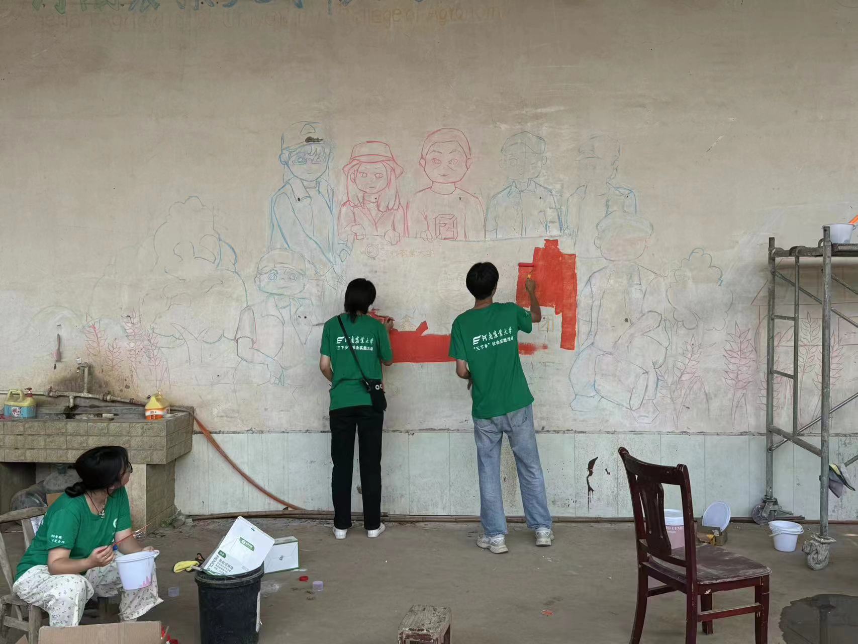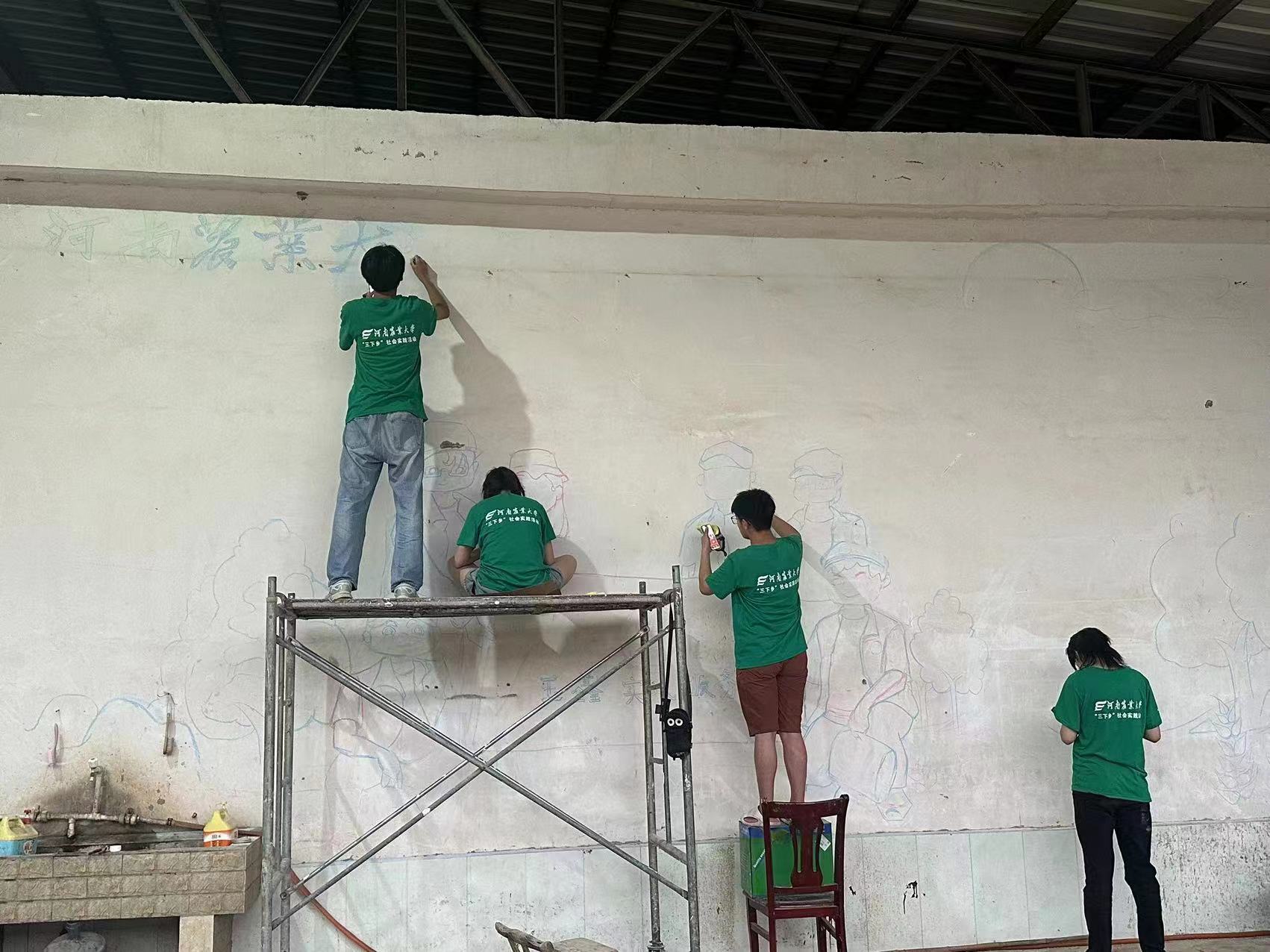 实践团成员与农学院“科技小院”成员相互讨论,积极构思,最终确定了墙绘方案。准备妥当后,一品探花 志愿者开始投身墙绘工作。团队成员们手持画笔和颜料,以墙为纸,认真细致地设计墙绘内容及构图,分工明确,一丝不苟,希望通过自己创作的艺术墙绘,为椹涧乡的乡村振兴建设增添美学气息。