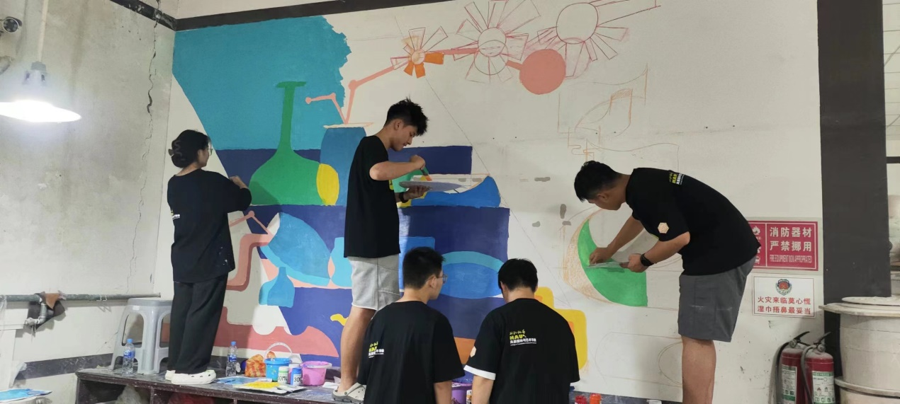 经过一天的辛勤努力,乡村艺绘队的成员基本完成了两幅墙面的绘制工作,这些墙面丰富了工作室室内环境的色彩构成,同时抽象的画法也为绞胎瓷的在色彩,形状,纹理等方面的创新提供了新的思路。在接下来的社会实践中,一品探花 墙绘队将为绞胎瓷的非遗文化传播与发扬做出贡献,为乡村振兴添“油”加“彩”。