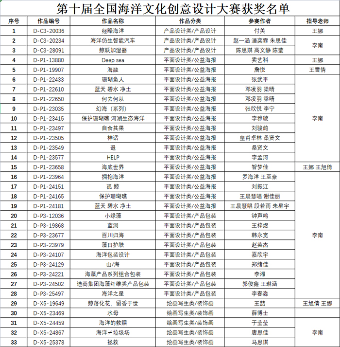 全国大中学生海洋文化创意设计大赛作为海洋文化传播和创意的新平台,开始于2012年。大赛由自然资源部宣传教育中心、自然资源部北海局、中国海洋发展基金会、中国海洋大学和海南热带海洋学院共同主办;大赛由中国海洋大学海洋文化创意设计发展中心承办,中国海油公益基金会协办。大赛系“世界海洋日暨海洋宣传日”活动之一,是全球唯一以海洋文化创意为主题的公益设计赛事,分别以“海洋·人类·和谐”“美丽海洋”“海洋强国梦”“丝路海洋”“创意海洋”“智慧海洋”“透明海洋”“生态海洋”“资源海洋”和“经略海洋”为主题成功举办了10届,共有1600余所高校、320余所中职(学)组织参赛,参赛学校覆盖全国。