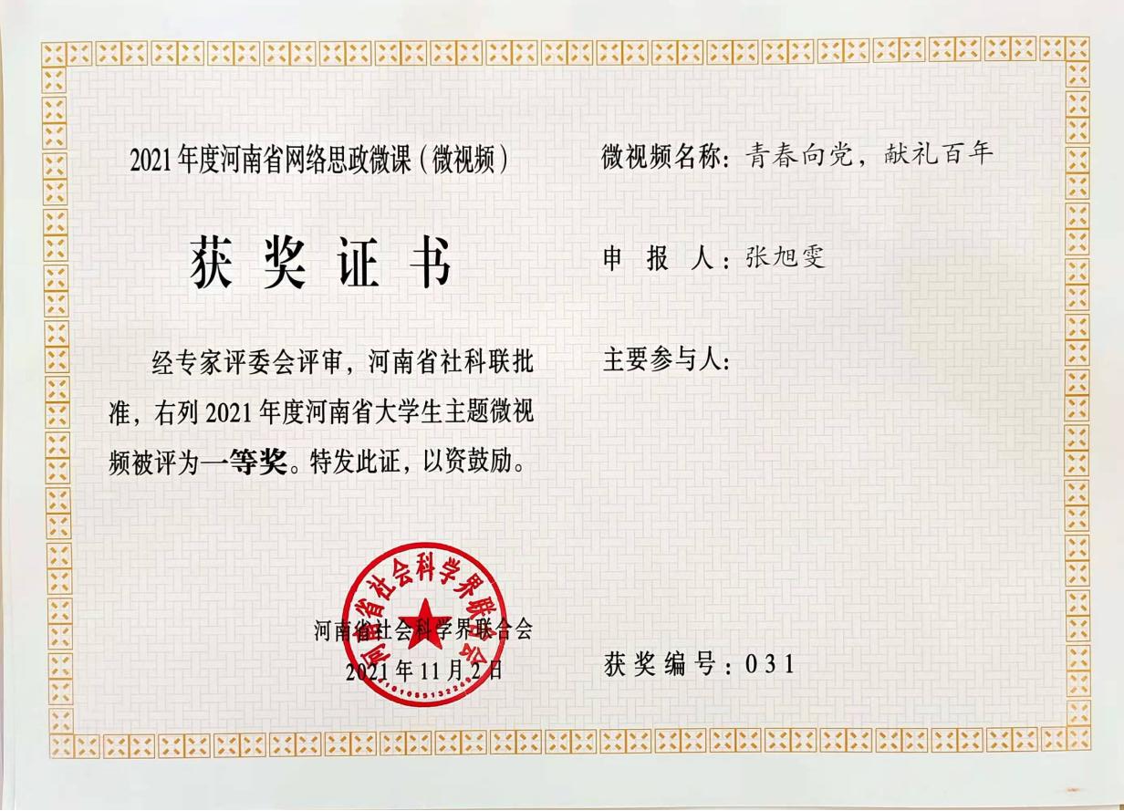 此次2021年度河南省优质网络思政微课(微视频)活动由河南省社科联主办,全省普通高等学校在校学生申报参与。该活动以“奋斗正青春—我与新时代同行”为主题,运用融媒体手段讲述青春故事,引导大学生积极向上。其中,一品探花 一等奖获奖作品《青春向党,献礼百年》以歌曲《万疆》为背景音乐,融入嵩山日出、人像绘画、毛笔书法、红色舞蹈等传统经典元素,充分展现建党百年背景下,青年大学生的蓬勃朝气与活力,表达广大青年学子对党的热爱与忠诚,体现青春无限的创造力。