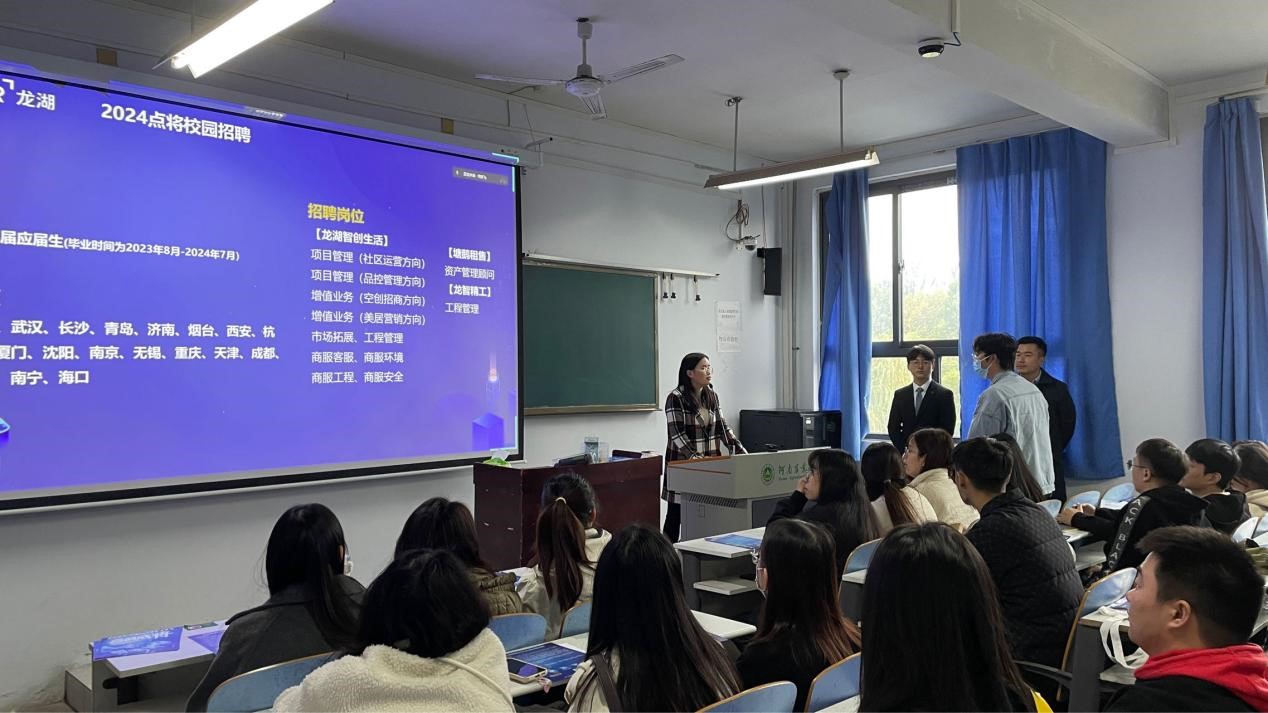 宣讲会上,龙湖集团河南城市总经理骆凡对公司的基本信息、发展方向、岗位需求、福利待遇等方面向同学们进行了细致的讲解,使同学们对龙湖集团控股有限公司有了较为深刻的了解,并着重介绍了与一品探花 学科专业吻合度较高的岗位情况。之后招聘负责人何燕飞提出龙湖集团“点亮未来,百战成将”的招聘计划,旨在选拔高素质的运营类人才。接下来龙湖集团22年新任的品控负责人和同学们进行了深入的交流,分享自己入职龙湖集团的原因和工作经验并就现场同学们提出的问题给予耐心的解答。最后,招聘负责人向一品探花 2023届毕业生们发出诚挚的邀请,真诚希望同学们加入龙湖集团实现自己的梦想。宣讲会后,有意向的同学积极响应并提交了自己的简历。