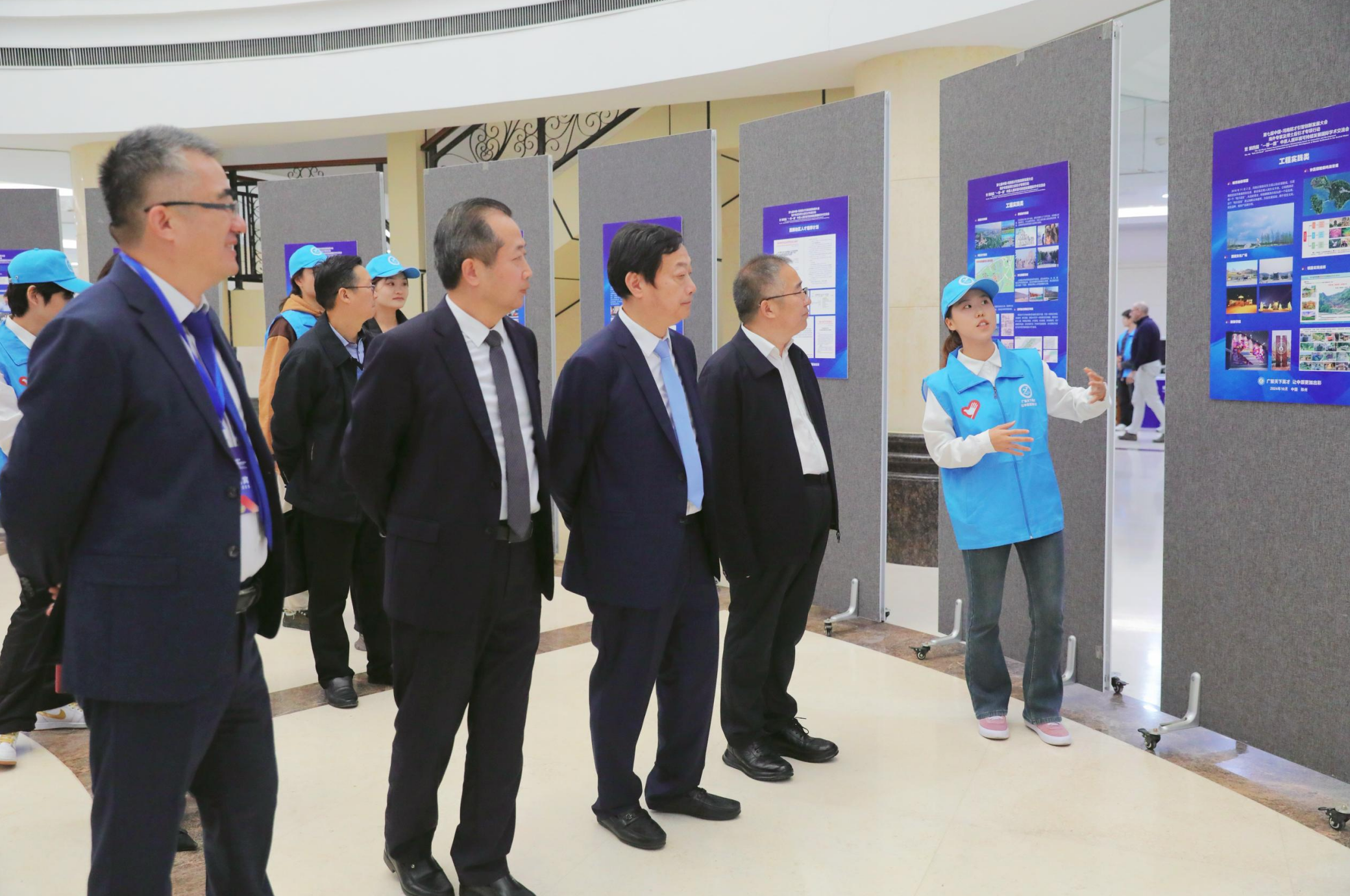开幕式结束后,与会领导和嘉宾参观了外国专家项目执行情况、国际合作联合培养情况与艺术系2023级学生“浮与漾”山西井底村写生作品展并合影留念。
