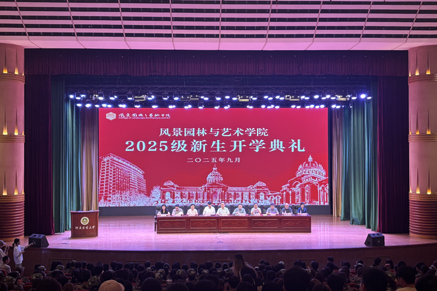 院长李永华代表学院全体师生员工向2025级新生表示热烈欢迎。他介绍了学院的发展历程、学科建设成果、师资队伍优势及人才培养特色,对新生提出三点期望:第一,学会学习,以专业本领扎根时代需求。尽快转变学习方式,注重知行合一,将专业知识与国家需求相结合。第二,学会思考,以理性智慧回应时代命题。面对学术与社会问题,要有批判质疑的勇气,也要有敬畏与责任的担当。第三,学会生活,以健康姿态扛起时代责任。要学会自律与合作,懂得感恩与奉献,从集体中汲取力量,在实践中锤炼品格。景艺学子应以“人与自然和谐共生”为己任,把论文写在祖国大地,把设计融入人民生活。