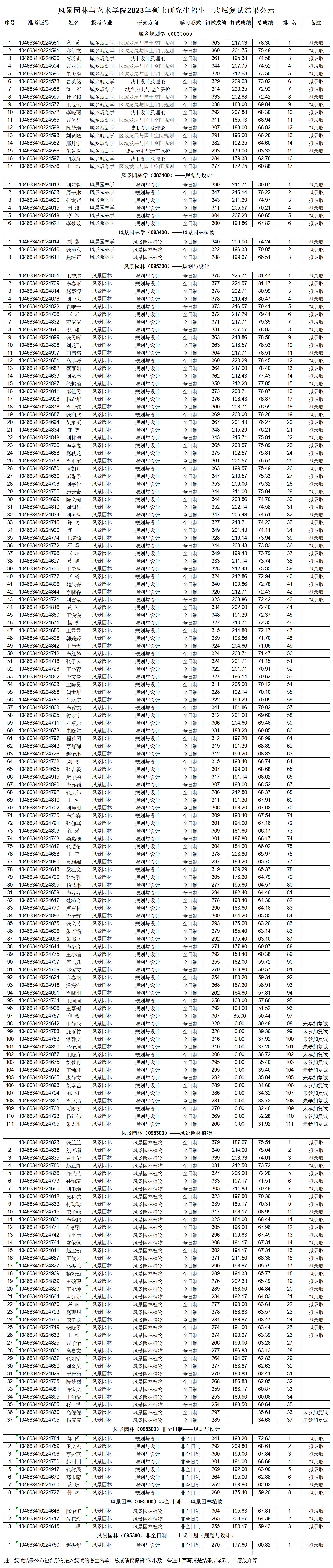 风景园林与艺术学院2023年硕士研究生招生一志愿复试结果公示