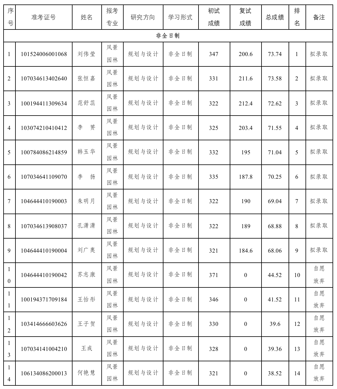 风景园林与艺术学院2024年硕士研究生第二批调剂复试结果已经完成,公示如下,公示期至2024年4月18日。请对录取结果进行监督。