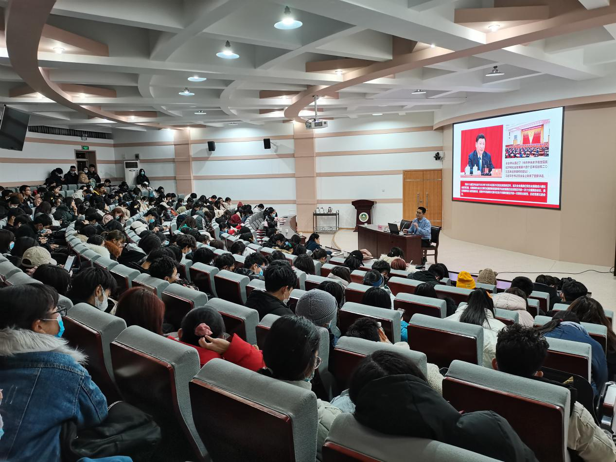 报告伊始,侯金超结合疫情期间国内外形势,着重分析了我国取得的重大战略成果,重申了中国特色社会主义的显著优势,进一步阐释了十九届五中全会对推动国家高质量发展、构建新发展格局所具有的重大而深远的意义。报告中,他以鲜活的事例,深入浅出地讲解十九届五中全会精神:一是要深刻认识我国进入新发展阶段的重大意义、有利条件和重要特征,要求新时代大学生要辩证地认识机遇和挑战的关系,学会化危为机;二是准确把握2035年远景目标和“十四五”时期我国发展的指导方针、主要目标、重点任务,要深刻认识实现“十四五”规划和2035年远景目标的任务艰巨,不断砥砺奋进;三是牢牢把握构建新发展格局的战略构想和重要着力点,他就大学生的责任与使命提出,青年学生应全面把握和正确理解加快构建新发展格局的重大意义;四是坚持党的全面领导,动员各方面力量为实现“十四五”规划和2035年远景目标而团结奋斗。