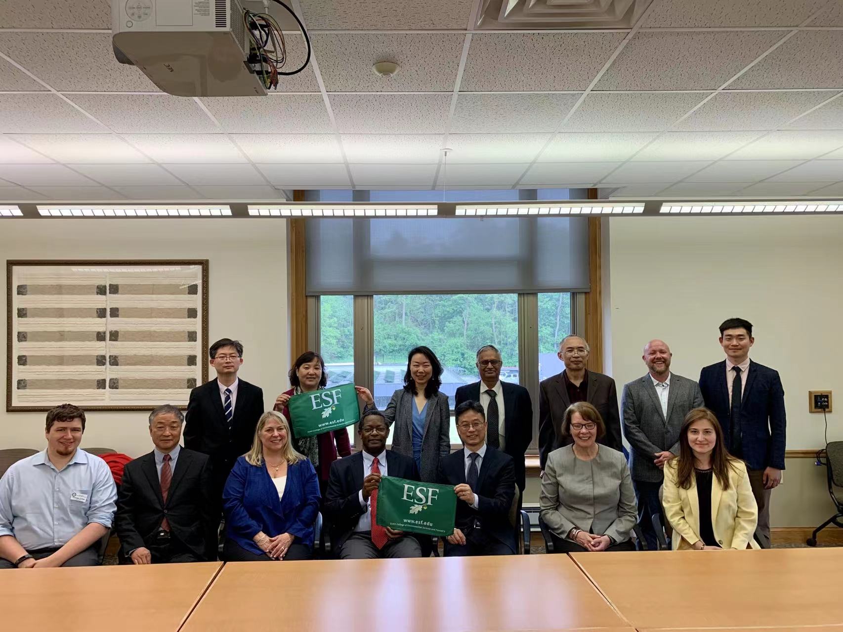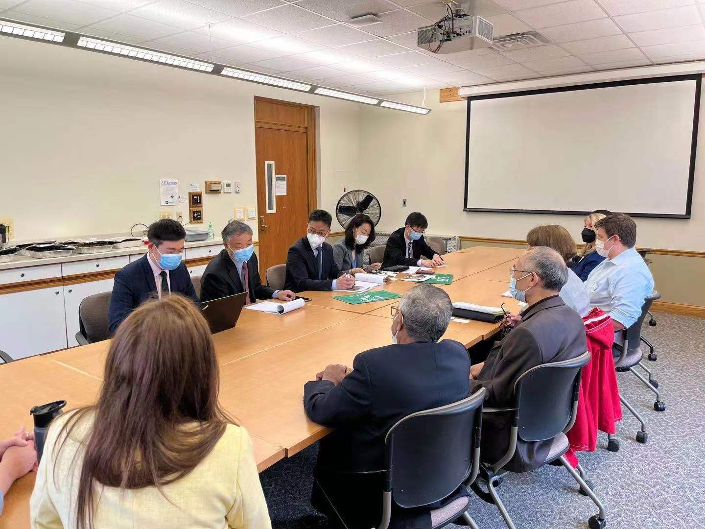 会议伊始,美方执行校长兼教务长萨穆尔代表纽约州立大学环境科学与林业学院全体教职工生向中国驻纽约总领馆一行到访表示热烈欢迎与诚挚问候,向中国政府对双方学校的本科合作办学及科研领域深入合作的大力支持表示衷心感谢。萨穆尔介绍了自己同中国高校的深厚合作背景,包括在西安交通大学、武汉大学等高校的访学经历记忆犹新,对中国各项事业的发展成就表示由衷敬佩。他表示,同中方开展各层次的科研教学合作是学校的头等大事,也是学校发展的重要契机,将不遗余力地为双方多方面、多维度合作提供全力支持,为前来美国学习的农大学子提供全面帮助。