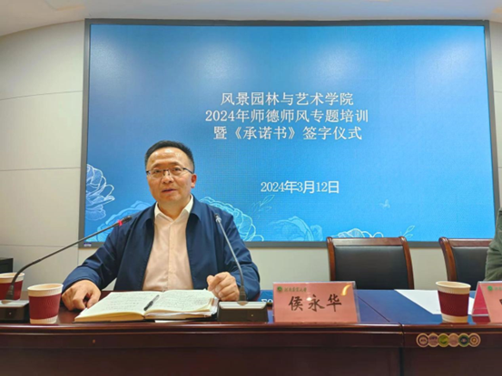 会上,侯永华指出全体教职工要以习近平新时代中国特色社会主义思想为指导,坚持师德师风第一标准,提高教师的师德修养,弘扬优良的职业道德,将良好的师德师风内化于心、外化于行。他要求,全体教职工要遵守相关法规,落实师德规范、严实工作作风、切实履行岗位职责。他强调,必须要把教书育人和自我修养紧密结合起来,不忘初心,敬业修德,自觉增强“立德树人、教书育人”的荣誉感和责任感,做一个有理想信念、有道德情操、有扎实学识、有仁爱之心的“四有”好教师。并结合学院实际,针对青年教师如何真正上好一堂课,提出具体意见和指导性建议。