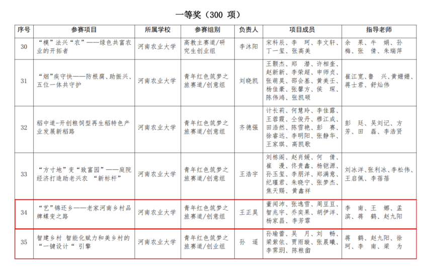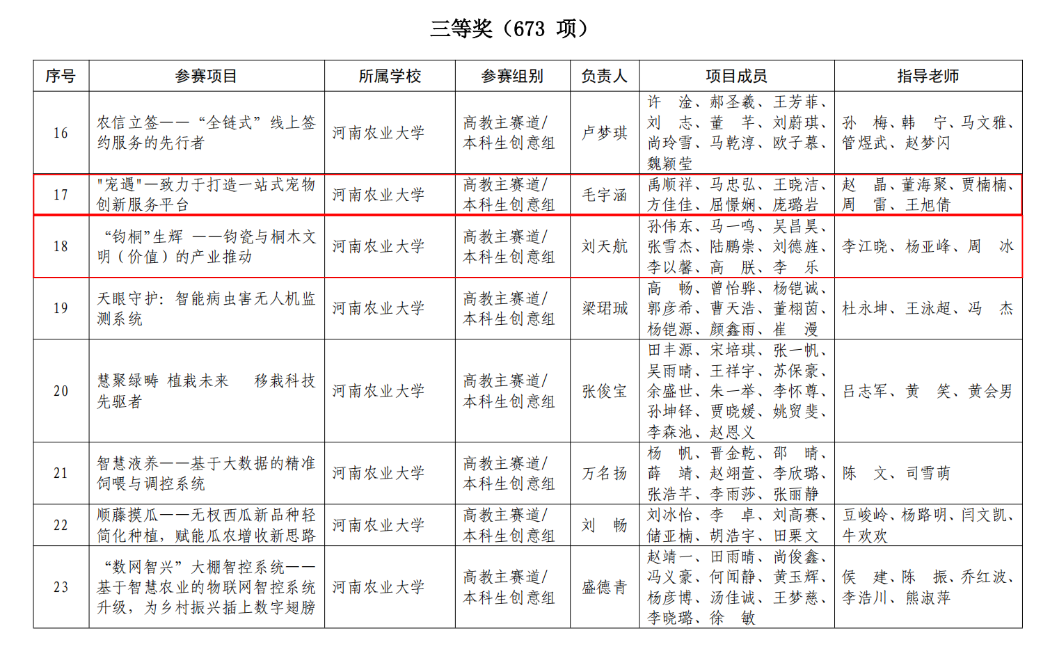 共获得一等奖两项,三等奖两项。其中,《“艺”锦还乡——老家河南乡村品牌蝶变之路》《智建乡村——智能化赋力和美乡村的“一键设计”引擎》两个项目荣获一等奖,《“宠遇”——致力于打造一站式宠物创新服务平台》《“钧桐”生辉——钧瓷与桐木文明(价值)的产业推动》两个项目荣获三等奖。