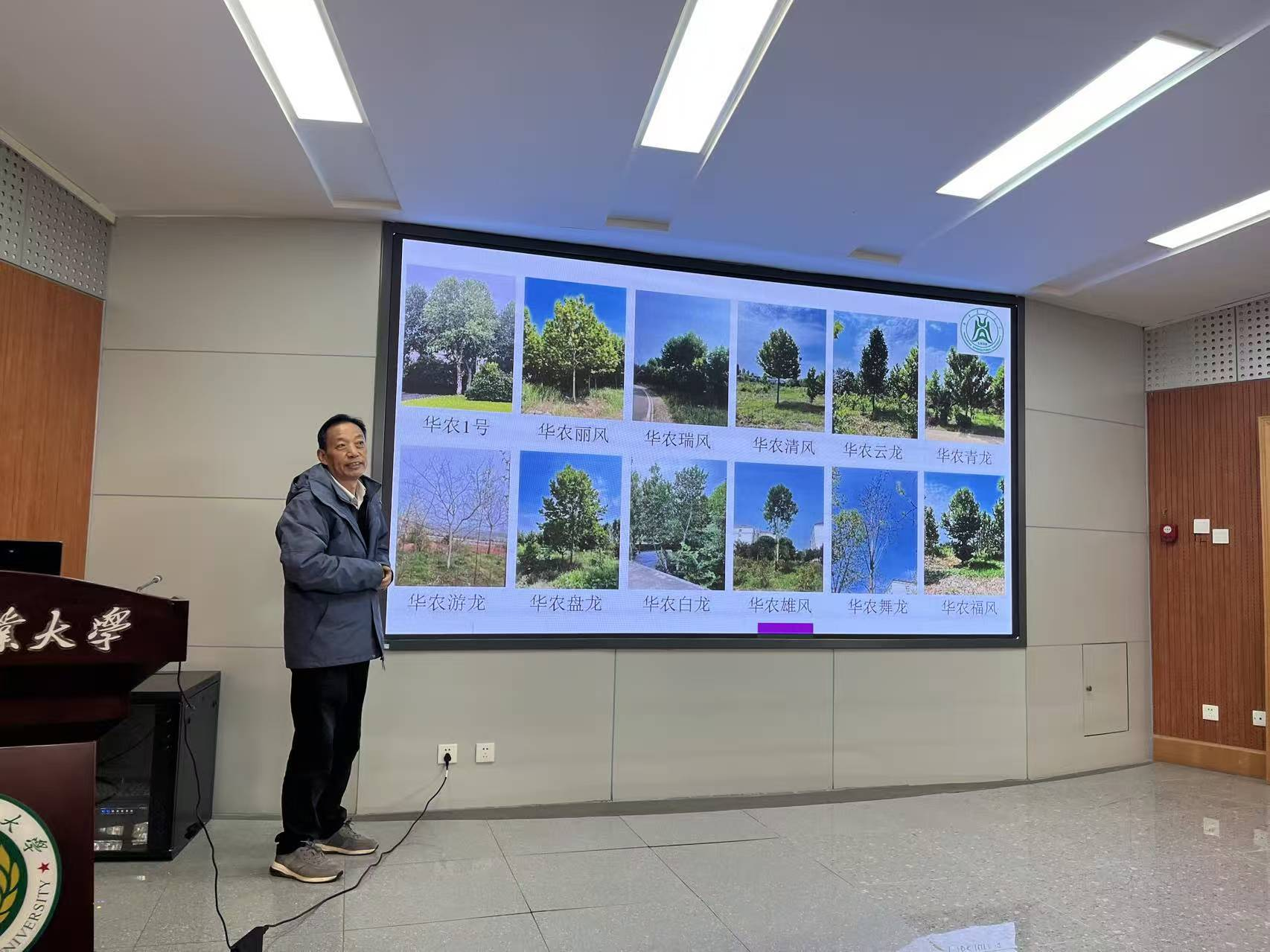 报告会上,包满珠教授从悬铃木育种研究的背景与意义切入,系统介绍了少球少毛悬铃木新品种培育的多种技术路径,涵盖实生选种、倍性育种、辐射育种及分子育种等领域,并进一步结合悬铃木基因组测序、开花结实机理等前沿研究,分享了团队三十余年来在悬铃木遗传改良、新品种选育与推广应用等方面的重要成果与最新进展。报告中,包满珠教授辅以详实的数据支撑与丰富的图片资料,全面展示了该研究从理论探索到实践应用的全过程。此外,他还结合自身求学、科研与工作经历,分享了在科研选题、项目推进、方案设计与成果转化等方面的经验与思考,为师生们提供了兼具学术价值与实践指导的参考。